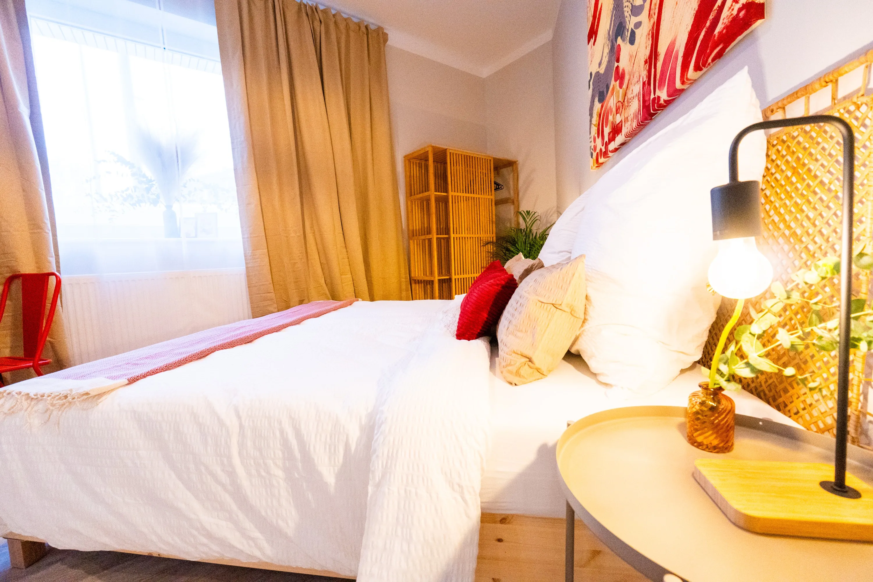 Wohnung war Stilvoll eingerichtet und die Betten sehr gut. Dazu alles geräumig gehalten. Fernseher hatte ein großes Bild. Und jedes Schlafzimmer hatte einen eigenen kleinen Schreibtisch. Dazu ein 2 Platten Induktionsfeld für die Küche. Die Bahn fast vor der Tür bringt einen Einfach ins Zentrum von Berlin.